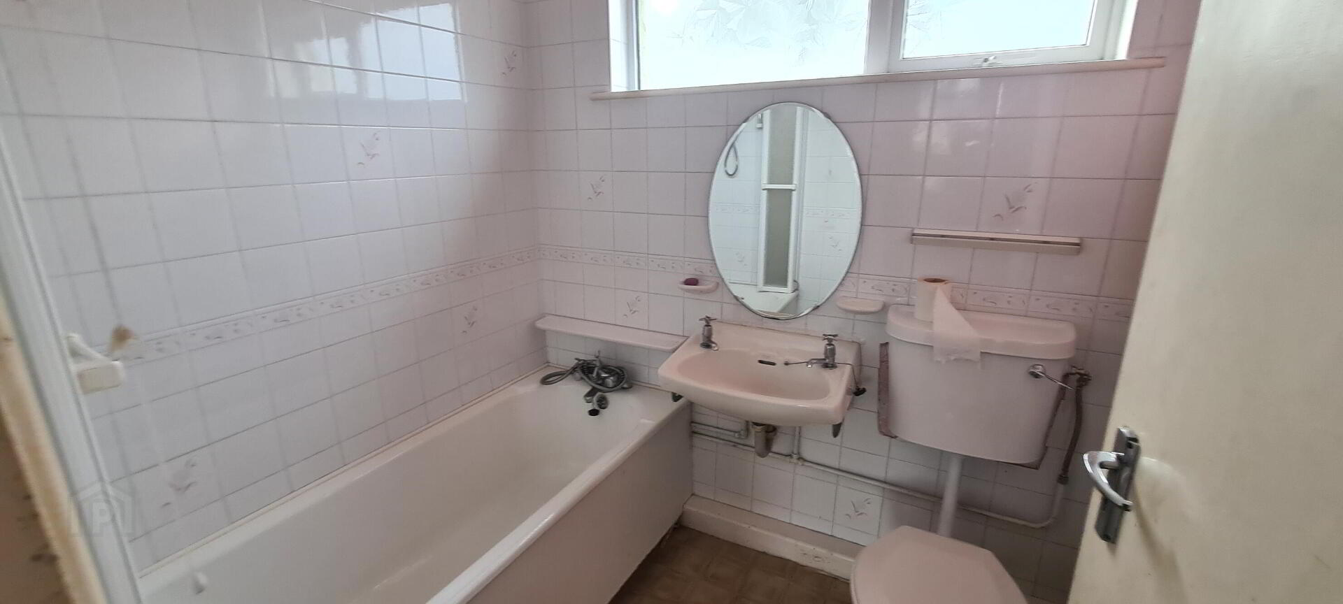 3.40m x 1.98m Bathroom with bath with shower over, whb, wc, window to rear, electric shower, mirror