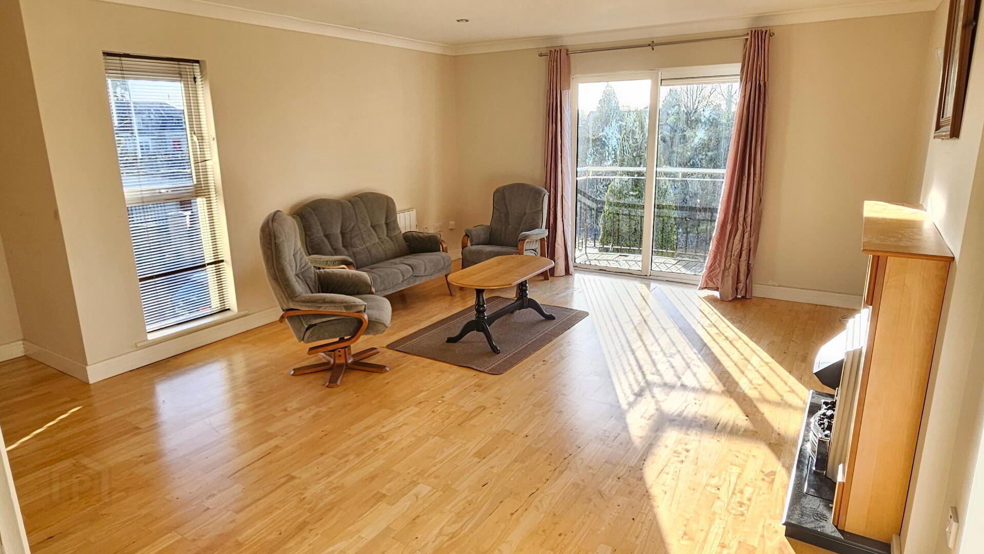 5.62m x 4.37m Spacious and bright living room at the rear of the apartment with electric fireplace, storage heater x 2, sliding glass door, window, wall lights, laminated flooring.