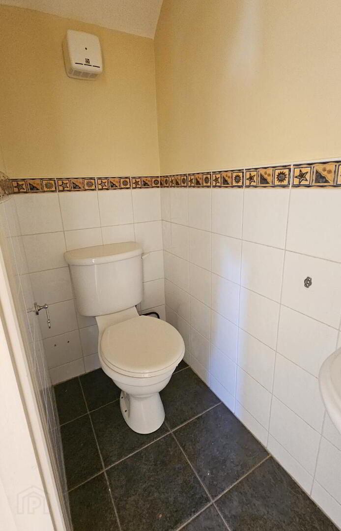 1.73m x 0.79m Downstairs wc with whb, mirror, half tiled walls, tiled flooring.