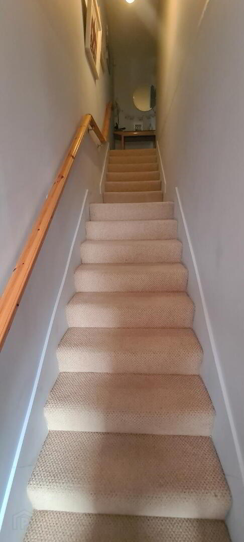 6.38m x 0.96m Entrance hallway with carpeted stairs with handrail leading to apartment on the second floor, electric storage heater, power points.