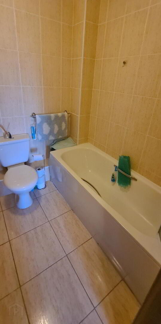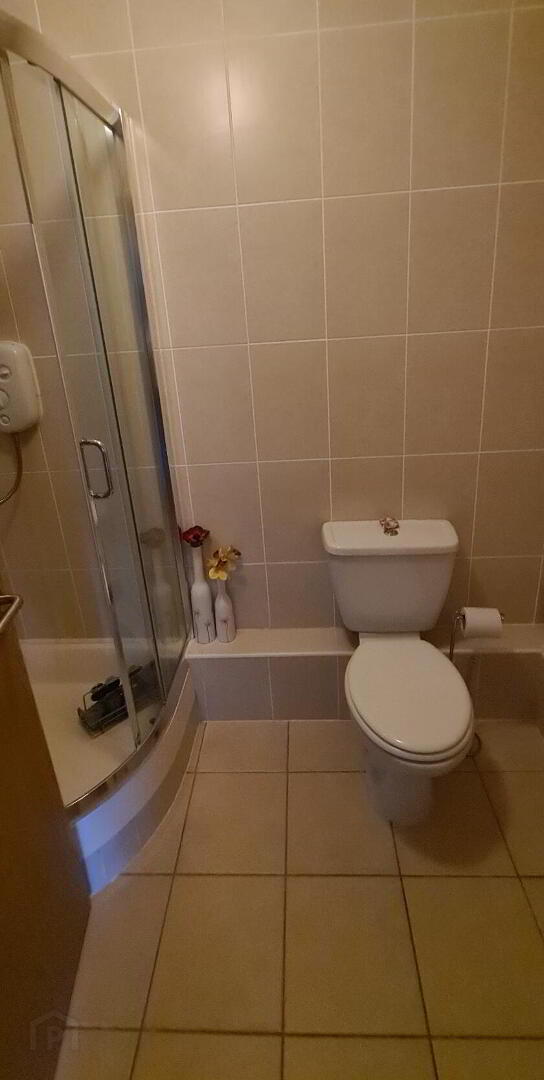 2.35m x 1.52m Bathroom with fully tiled walls and floors, whb, wc, mirror, fan heater and power shower.