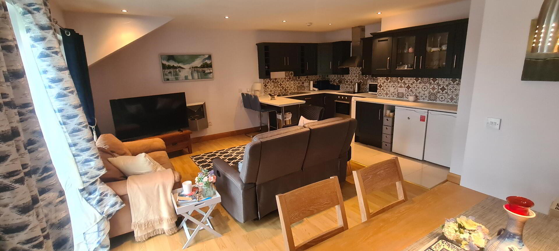 7.10m x 5.66m Open plan living kitchen and dining area. Kitchen has new fitted kitchen with lots of storage space, dishwasher, electric hob and oven and extractor fan, single drainer sink, tiled flooring. Living area with laminated flooring, patio door to large balcony overlooking the marina and waterway, feature electric fireplace, spotlights, storage heater, power points and tv point, dining area with view to marina.