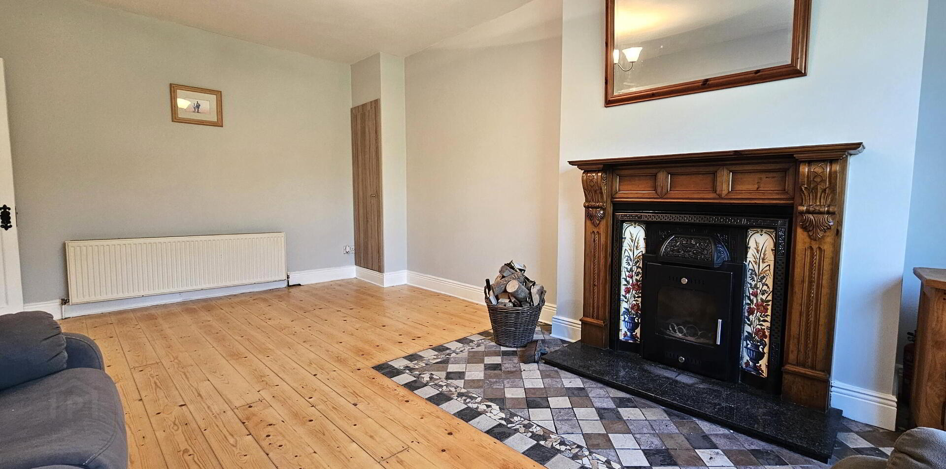 5.85m x 3.69m Solid wood flooring, fireplace with inset stove and granite hearth, tv point, power points, radiator.