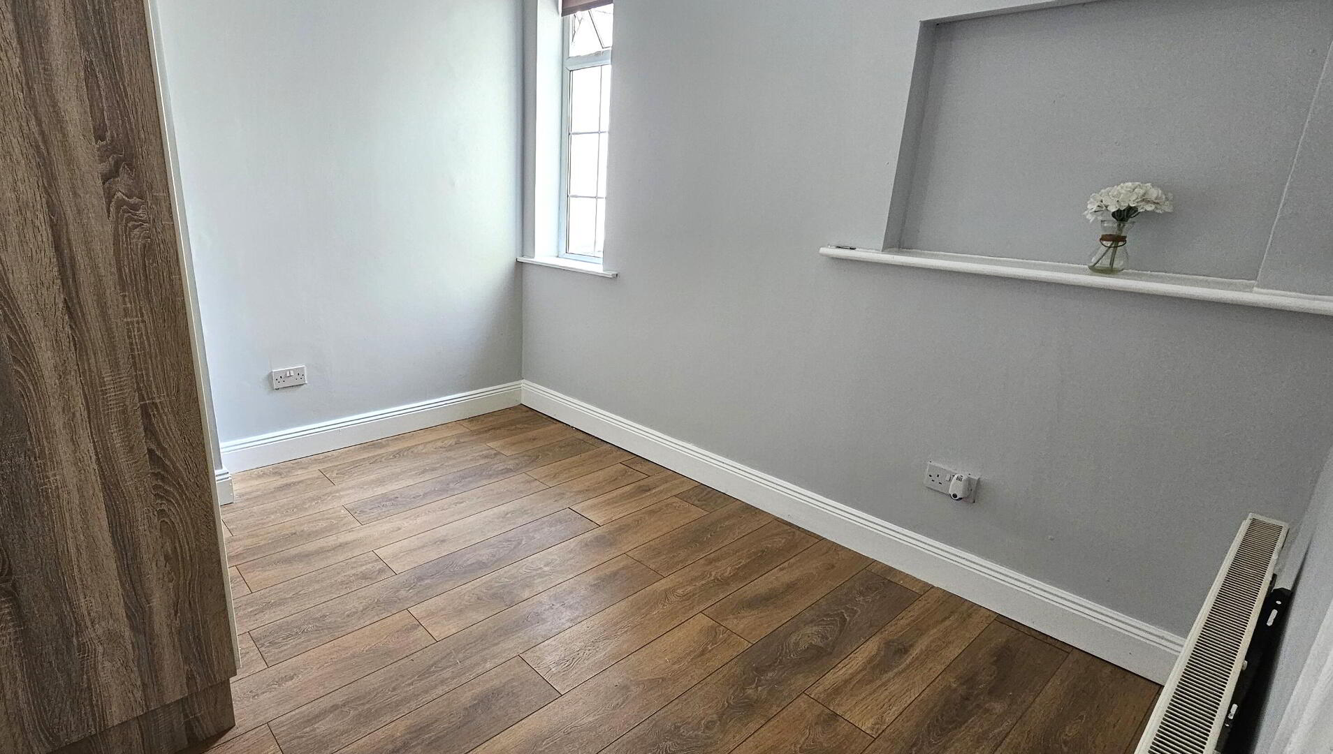 3.04m x 2.61m Laminate flooring, radiator, power points.
