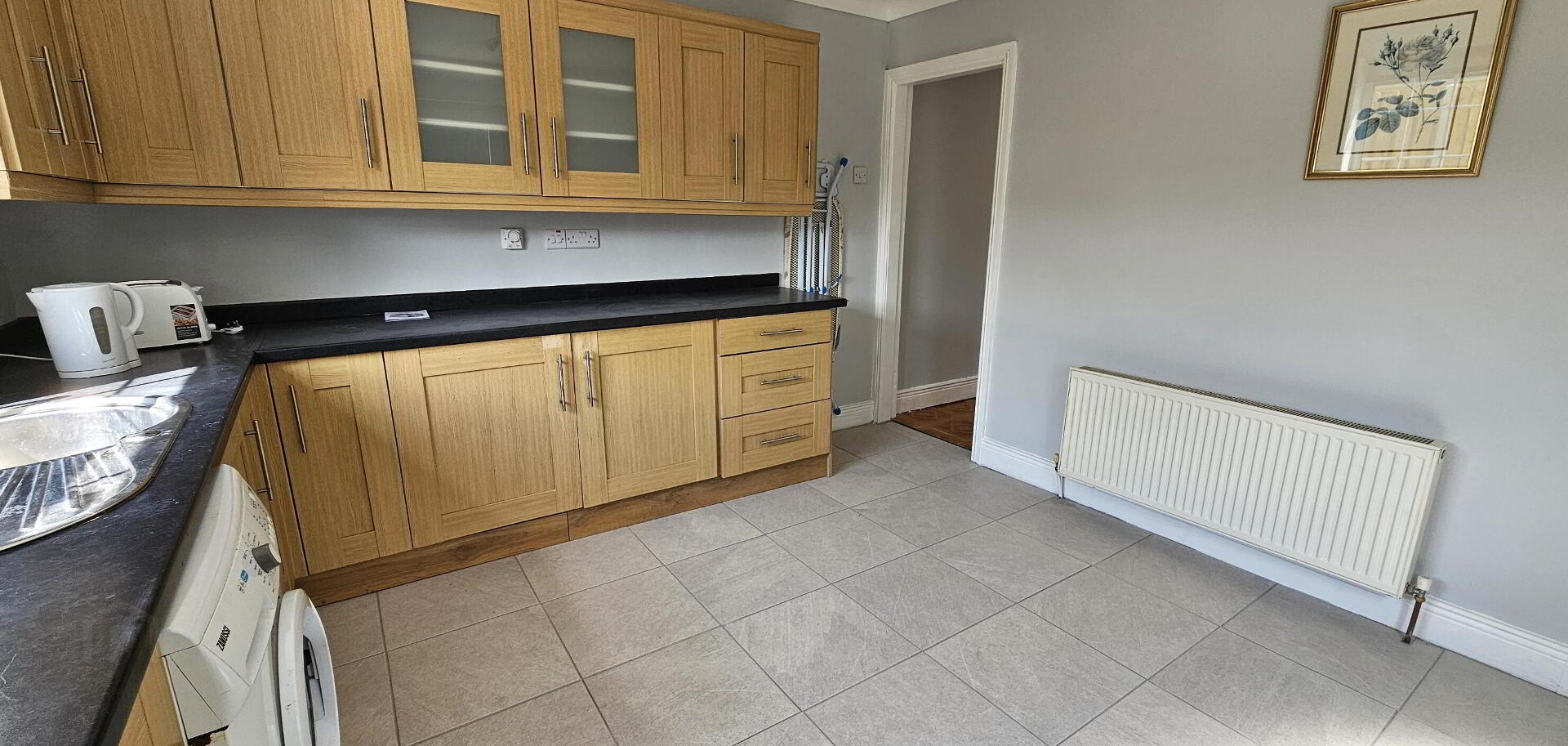 3.65m x 3.55m Tiled floor, fitted shaker kitchen, radiator, power points, integrated hob, oven & extractor fan, washing machine, coving to ceiling.