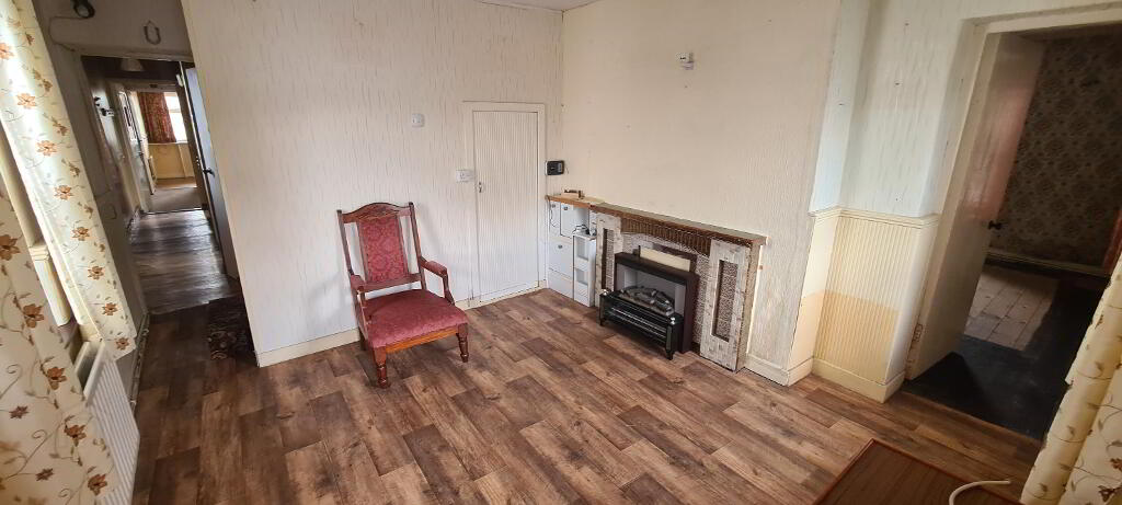 3.46m x 3.45m Living room to the front with fireplace with tiled surround, lino on floor and understairs storage with hot water cylinder, 2 no. windows, radiators, door through to sitting room, opening to hallway to rear of the house.