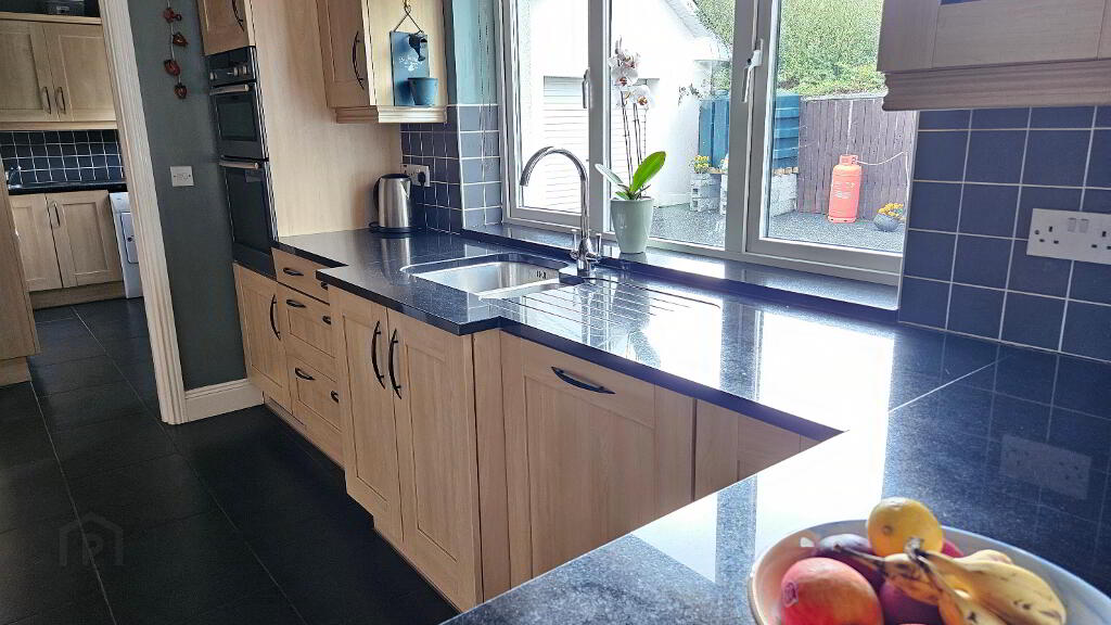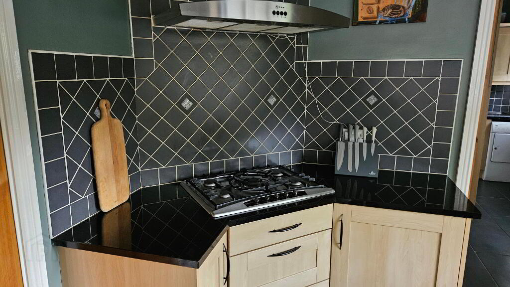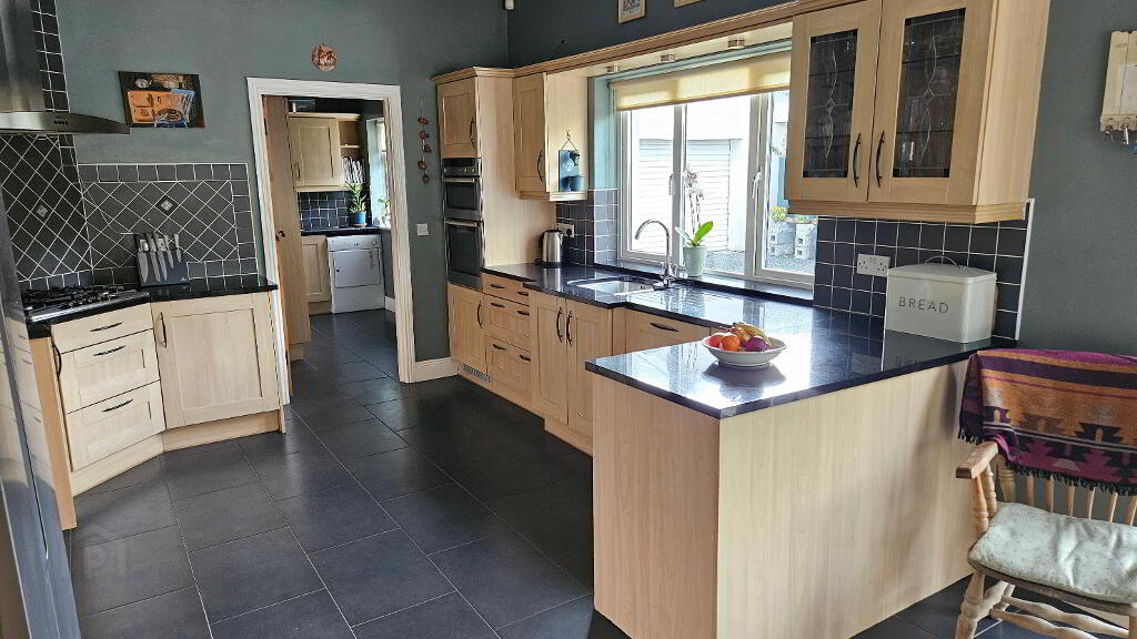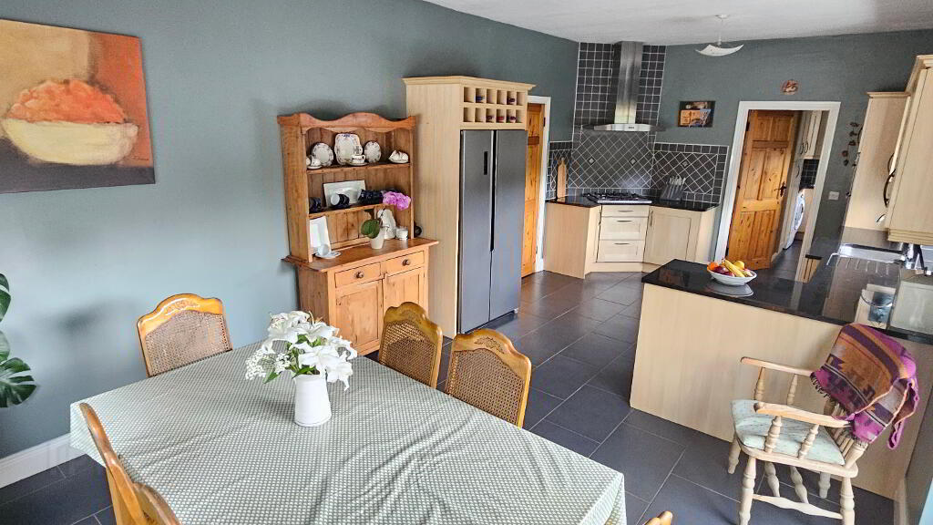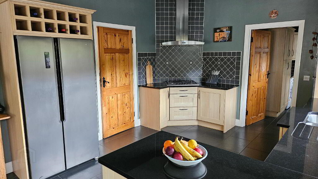 7.37m x 3.59m Tiled floor, solid shaker style kitchen with tiled splash back, granite counter top, NEFF gas hob, NEFF chrome extractor fan, NEFF double oven & grill, integrated dishwasher, recessed lights to dining area, radiator, power points, tv point, plumbing available for am American style plumbed fridge.
