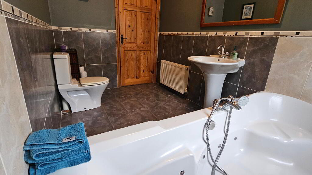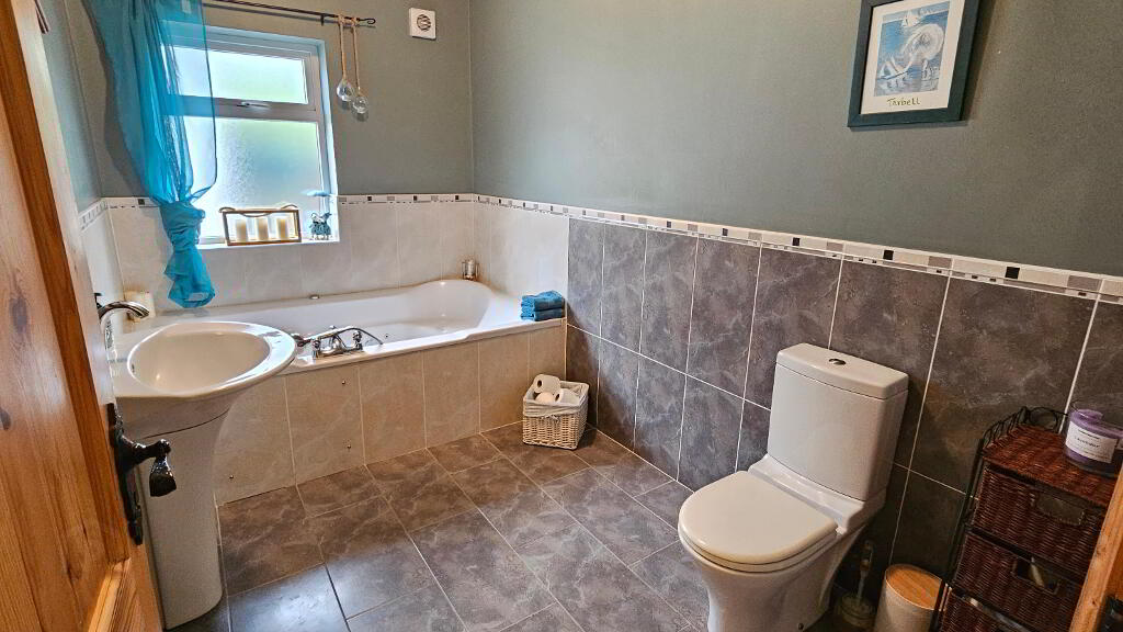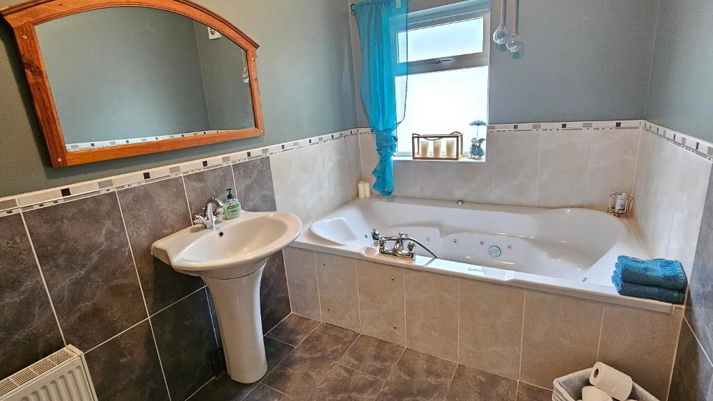 3.58m x 2.04m Tiled floor, part tiled wall, light point over mirror, extractor fan, jacuzzi bath with shower mixer, radiator, wc, whb.