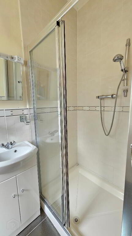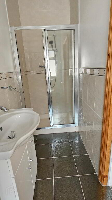 3.60m x 1.13m Tiled floor, part tiled walls, tiled shower cubicle, wc, whb, radiator, shaving light with socket, extractor fan.