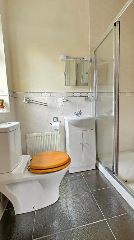 2.15m x 1.36m Tiled floor, part tiled walls, tiled shower cubicle, wc, whb, radiator, shaving light with socket, extractor fan.
