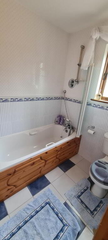 Bathroom with tiled flooring, window to rear, whb, wc bath with shower over, half tiled walls.