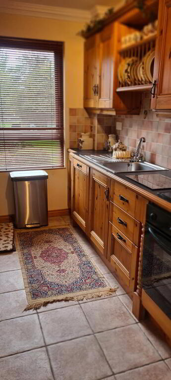 3.48m x 1.86m Fitted kitchen with window to front, tiled flooring, fitted units with lots of storage space, single drainer sink, tiled over countertop, door through to hall and utility, integrated fridge freezer, electric cooker.