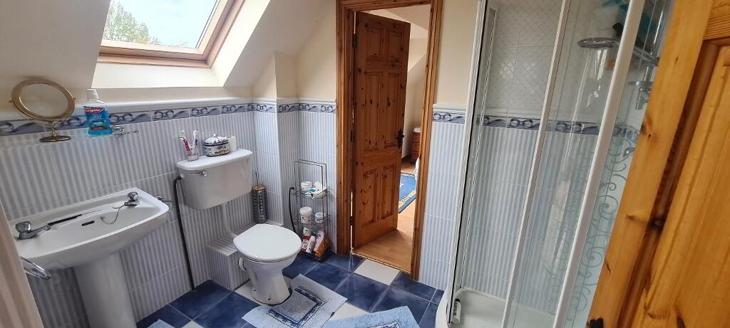 2.41m x 1.98m Bathroom with tiled flooring, half tiled walls, whb, wc, shower, shaver point, door to second bedroom.