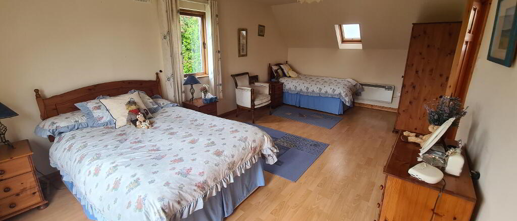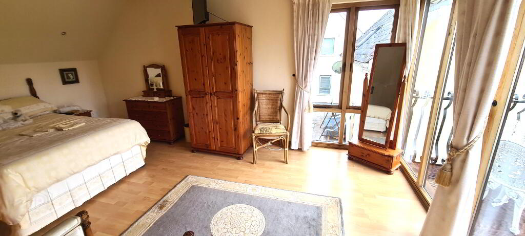 6.38m x 3.58m Very large and bright double bedroom on the first floor with doors leading out to balcony area overlooking the harbour, laminated flooring, electric storage heater, tv and power points, door to Jack and Jill bathroom.