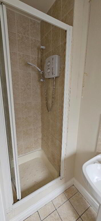 2.42m x 0.98m Tiled floor, wc, whb, tiled shower cubicle with electric shower, radiator, extractor fan, shaving light and socket.