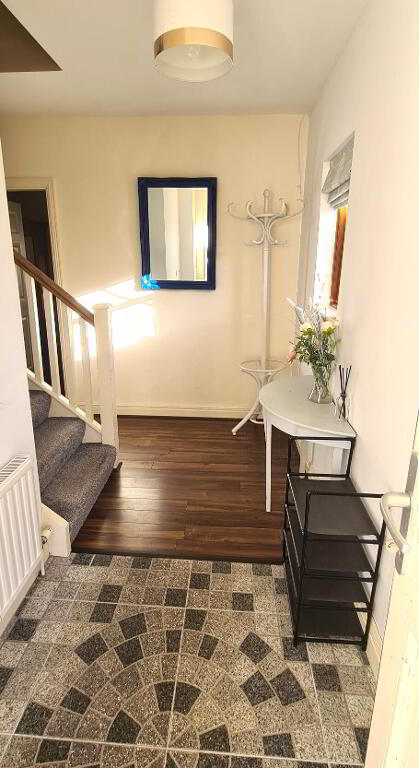 3.54m x 1.47m Entrance hallway with tiled flooring, radiator, power points, window, carpeted stairs to first floor, Airing cupboard, storage cupboard under the stairs.