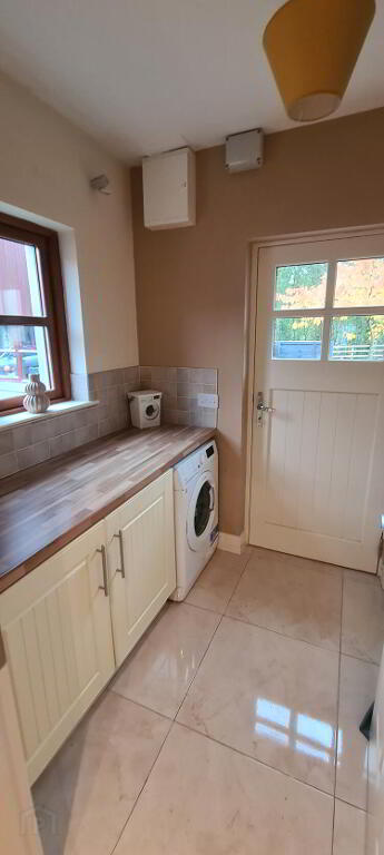 2.36m x 1.76m Utility room with fitted units, rear door to patio, tiled floor and over counter, loads of storage space, washing machine, power points.