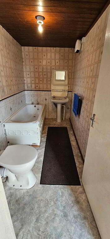 3.13m x 1.63m Bathroom with wc, whb, bath, part tiled walls, lino on floor, fan heater, timber ceiling, window.