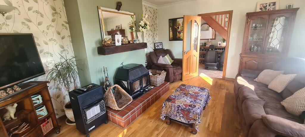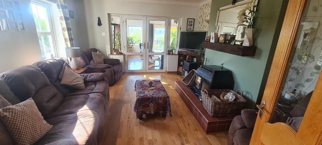 4.98m x 4.14m Living room with semi solid floor, solid fuel log burner with back boiler, windows to the front of the house, power points, glass doors to conservatory, wall lights.