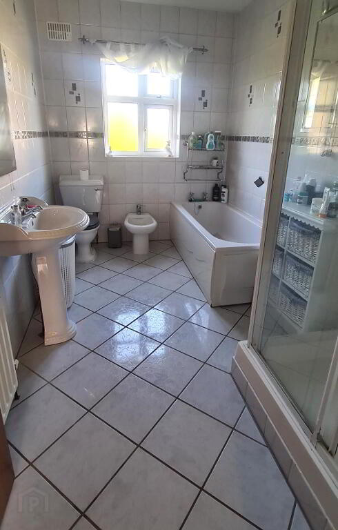 3.77m x 2.09m Bathroom with large shower, pumped shower, bath, bidet, whb, wc, window, fully tiled on wall and floor, radiator, mirrored cabinet mirror with light.