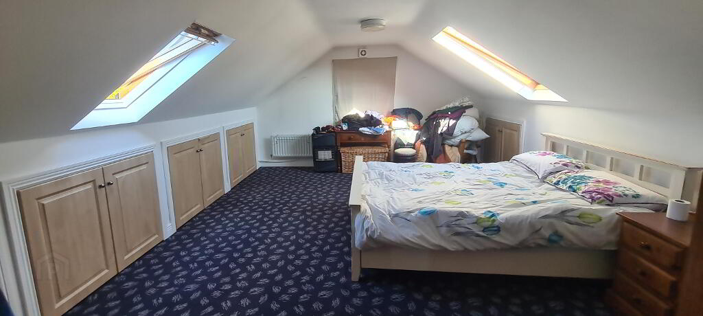 6.10m x 4.07m Large bedroom with 2 no. velux windows,storage space, power points, radiator, window on gable, power points.