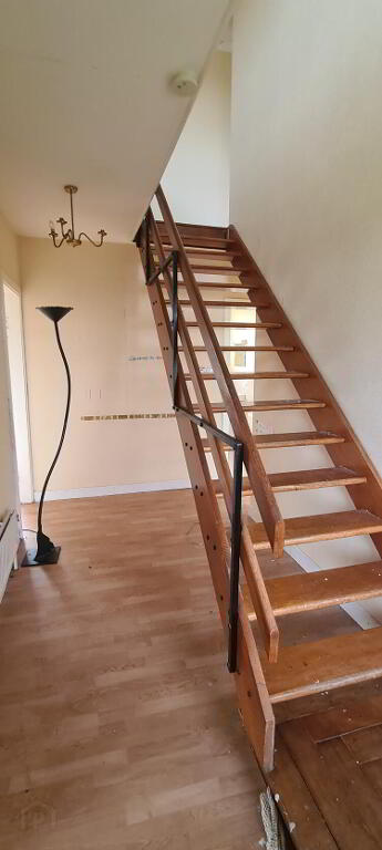 2.05m x 0.65m Entrance hallway with laminated flooring, radiator, wooden stairs to first floor, door and glass window to sittingroom for extra light.