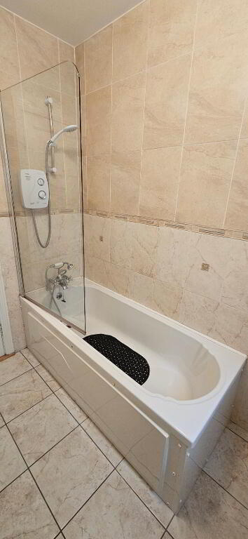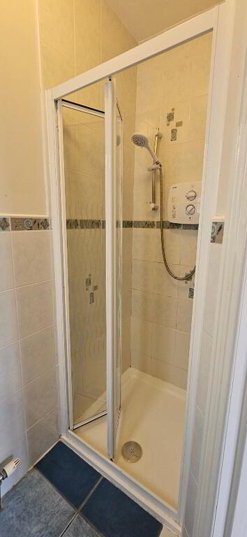2.31m x 1.78m Tiled floor, part tiled walls, wc, whb, bath with power shower over, radiator, extractor fan.