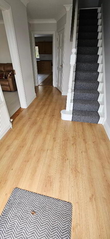 4.94m x 2.12m Laminate flooring, wooden stairs with carpet runner, radiator, phone point, ceiling coving, wc under the stairs with tiled floor, wc, whb, radiator and extractor fan.
