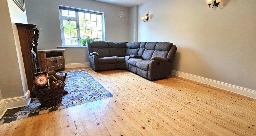 5.85m x 3.69m Solid wood flooring, fireplace with inset stove and granite hearth, tv point, power points, radiator.
