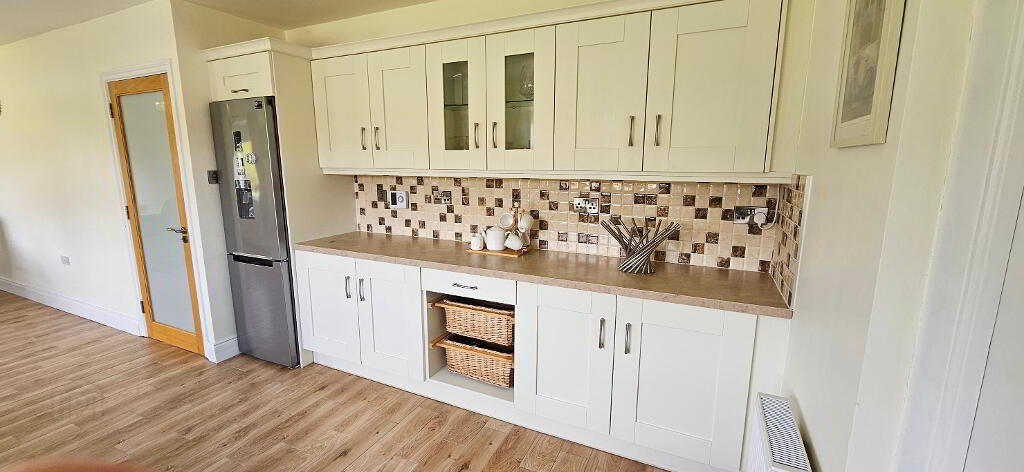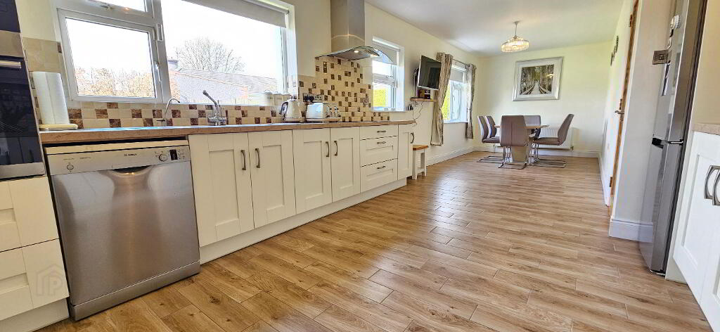 9.11m x 2.71m A large open space extending the width of the house, wood effect tiled floor, cream shaker style kitchen, 2 areas of units and counter top space, integrated micro wave, integrated grill & oven, integrated hob with extractor fan, tiled splash back, brushed steel sockets and switches to the kitchen area, integrated water filtration system, radiator to kitchen area, radiator to dining area, tv point and sockets for wall mounted tv, 3 windows over looking back garden, access to garage.