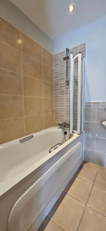 2.46m x 1.69m Tiled floor, part tiled walls, radiator, bath with tiled surround & shower over, radiator, extractor fan, recessed lights.