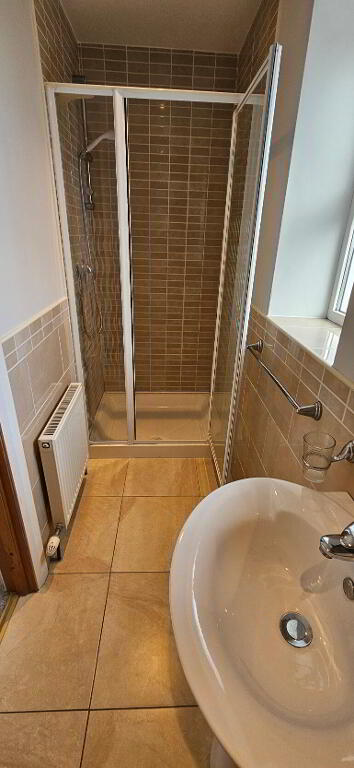 3.62m x 0.99m Tiled floor, part tiled walls, tiled shower cubicle, with glass door, wc, whb, extractor fan, recessed lights, radiator.