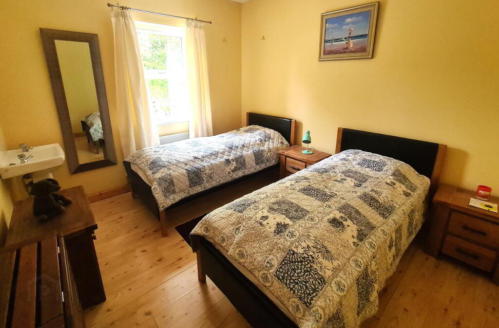 3.58m x 3.30m Double bedroom at the front of the house with views over Lough Scur, power points, laminated flooring, 1 no. window to the front, wooden panelling on walls, whb and mirror with shaver light, radiator.