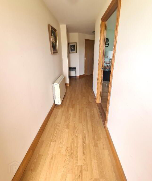 Entrance hallway with laminated flooring, storage heater, storage cupboard, entrance to living area and kitchen from hallway.